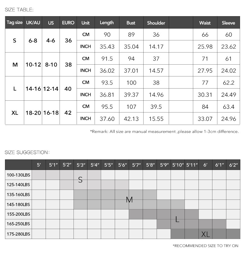 Note:1. Asian sizes are 1 to 2 sizes smaller than European and American people. Choose the larger size if your size between two sizes. Please allow 2-3cm differences due to manual measurement. 2. Please check the size chart carefully before you buy the item, if you don't know how to choose size, please contact our customer service. 3.As you know, the different computers display colors differently, the color of the actual item may vary slightly from the following images.